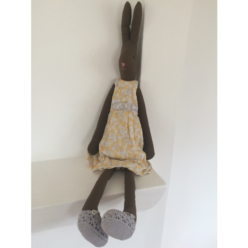 Stor mörk kanin med blommig klänning och stickade ballerinaskor från danska Maileg! Har endast använts som prydnad och är i fint skick. H: ca 72 cm.